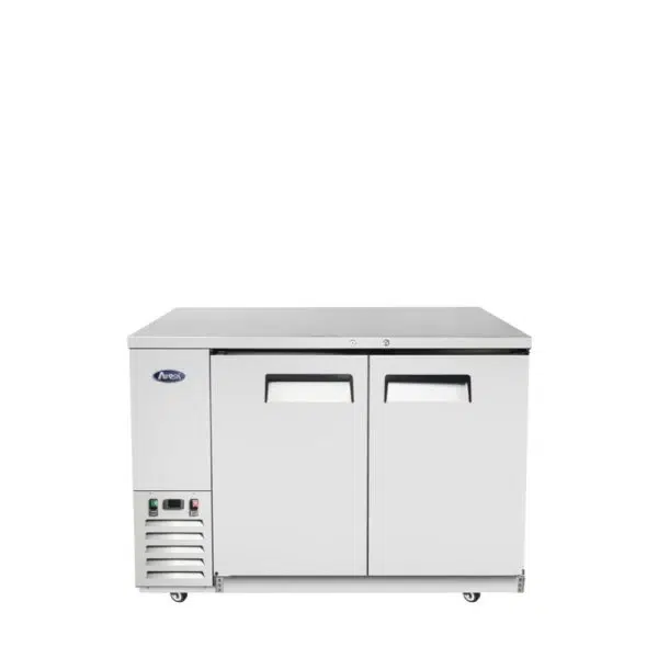 Mesa Refrigerada Back Bar COLOR ACERO con 2 puertas SOLIDAS de 1220x662x1020 mm (con garruchas)