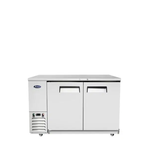 Mesa Refrigerada Back Bar COLOR ACERO con 2 puertas SOLIDAS de 1500x662x1020 mm (con garruchas)|